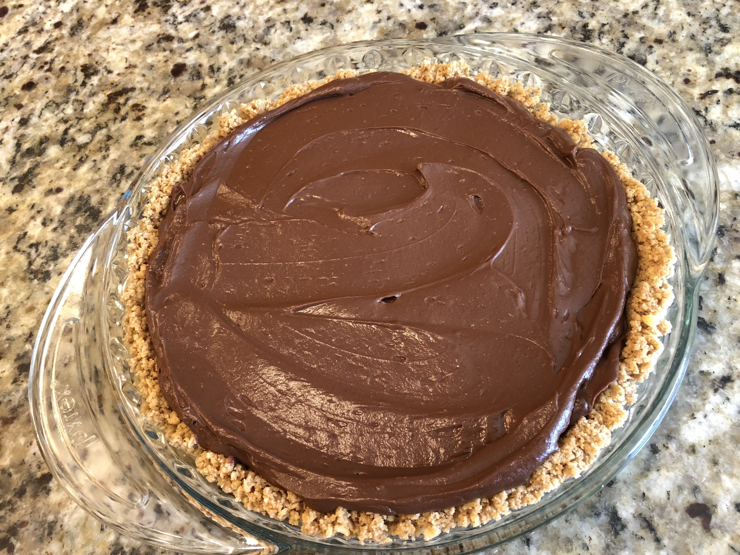Pour cooled chocolate filling into the graham cracker crust. Cover the pie with plastic wrap and set into the refrigerator for at least 2 to 3 hours to chill.