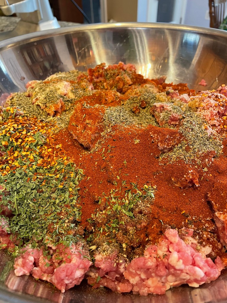 *If you don’t have a meat grinder, store-bought ground pork can be used. You can also substitute equal parts of ground turkey or ground beef chuck. If you use ground turkey, you’ll need to cook the sausage with extra canola, vegetable or EVOO to prevent it from sticking to the pan.